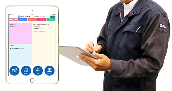 「電気点検簿」システムは、点検報告書(電気設備の安全を確保するために行う「月次点検」「年次点検」の記録をまとめた書類)を電子化することで、タブレット端末での入力やPDFでの保管が行えるようにしたシステムです。書類をペーパーレス化することで保管場所の省スペースが図れ、管理業務の低減や5Sを実現します。環境面では郵送時のCO2削減にもつながります。